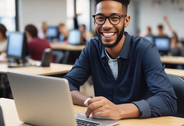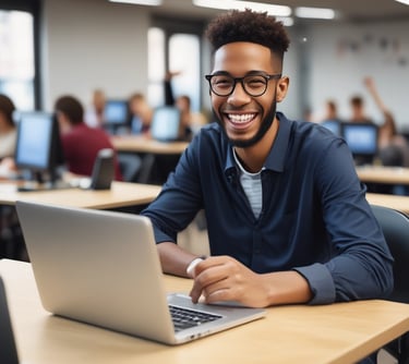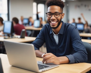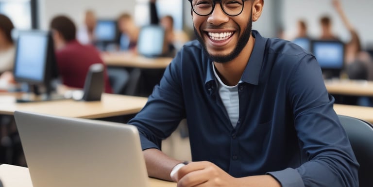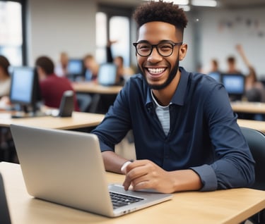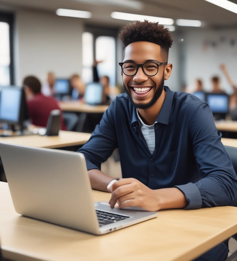 Image suggestion: Employee happily working on a laptop in a classroom or office, with an IT technician monitoring remotely in the background.
